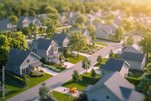 A picturesque suburban neighborhood basks in the warm afternoon sun, showcasing charming houses and lush greenery.