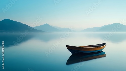 A picturesque view of a small wooden boat gently floating on a serene blue lake during the tranquil dawn hours of early morning.