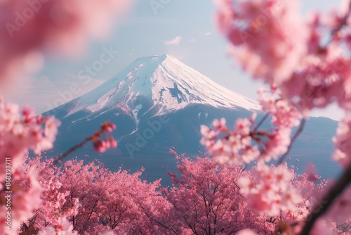 A picturesque view of Mount Fuji with a foreground of vibrant pink sakura trees in full bloom