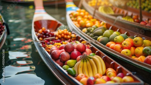 A picturesque view of the floating markets in Thailand with vibrant boats and exotic fruits, market setting with lively color, Vibrant style