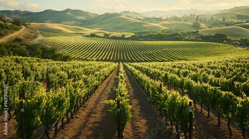 A picturesque vineyard with neatly arranged grapevines and rolling hills in the background, capturing the charm and beauty of the countryside