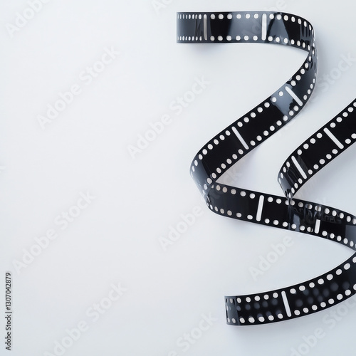 A piece of black and white film reel spiraling gracefully against a plain background, symbolizing the art of cinematography.
