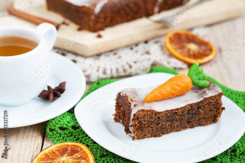 A piece of carrot cake with nuts, decorated with marzipan carrot