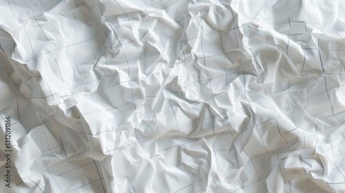 a piece of crumpled white paper with a delicate grid overlay, depicted in hyper-realistic detail. The folds and creases should be highlighted by soft