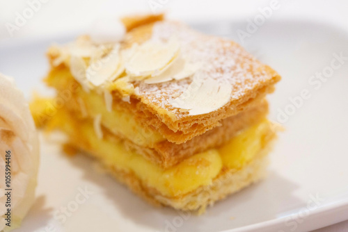 A piece of millefeuille cake on a plate. Close-up