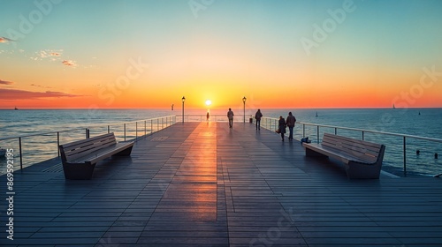 a pier with benches and people walking on it