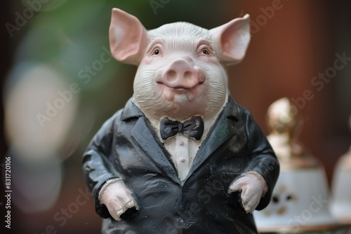 A pig figurine in a suit and bow tie exudes a cute and unique charm. Its whimsical and creative design stands out.