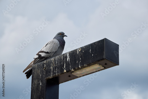 A pigeon sits gracefully on a street lamp under a cloudy sky, creating a serene scene