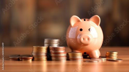 A piggy bank with coins on the table. Generative AI