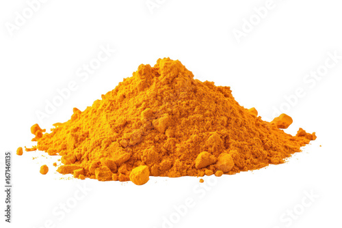 A pile of bright yellow turmeric powder isolated on a transparent background, showcasing its vibrant color and fine texture