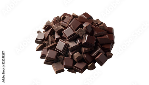 A pile of chopped dark chocolate pieces on a transparent background. The chocolate pieces is appear rich, dark
