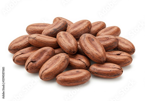 A pile of cocoa beans arranged together on a white surface in a studio setting close up view