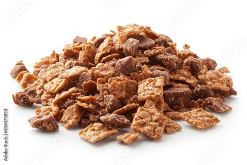A pile of crunchy cereal clusters with chocolate chips, showcasing a delicious mix of textures perfect for breakfast or a tasty snack