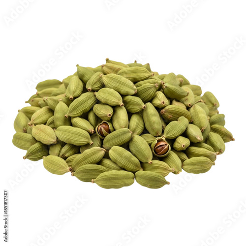 A pile of dried green cardamom pods with visible seeds isolated on transparent background