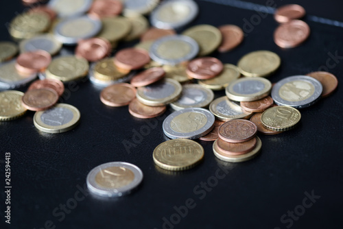 A pile of euro coins scattered on a dark surface close up