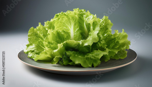 A pile of fresh green lettuce is placed on a ceramic plate on a plain gray background