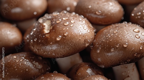 A pile of fresh mushrooms with water droplets glistening on their smooth surface, showcasing their natural texture.