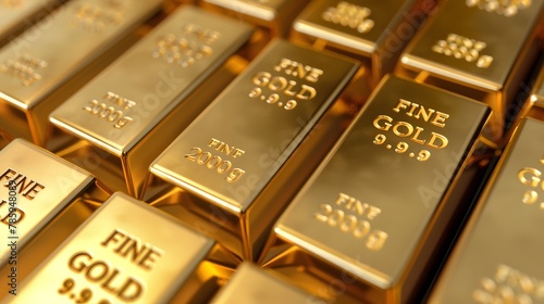 A pile of gold bars with the words FINE GOLD engraved on them, arranged neatly in rows and columns.