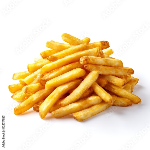 A pile of golden, crispy french fries isolated on a clean white background