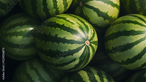 A pile of green and black striped watermelons with white stripes, Generative AI