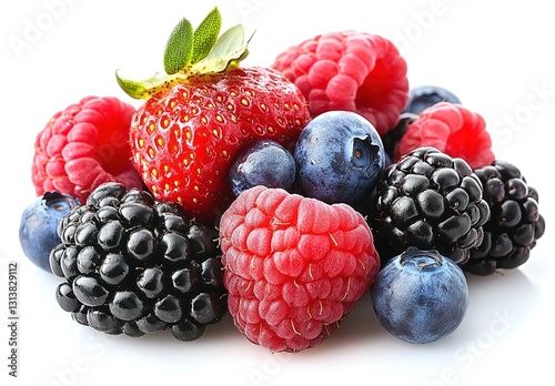 A pile of mixed berries including blueberries, blackberries, native strawberries, and raspberries on a white background.