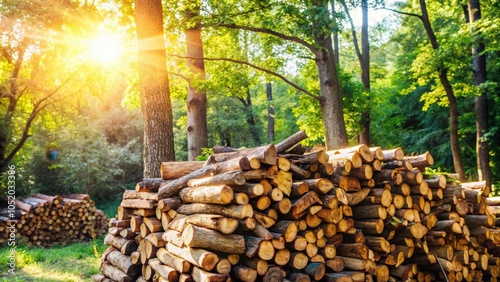 A pile of neatly stacked logs bathed in the golden light of the sun, nestled amongst a lush forest of towering trees.