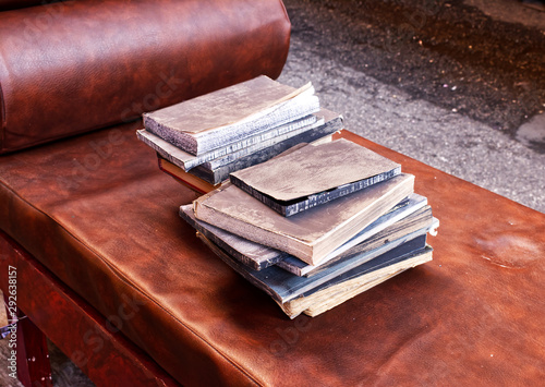 A pile of old books on a sofa