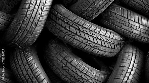 A pile of old, worn-out tires with visible tread patterns and a dark, textured surface.
