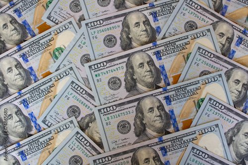 A pile of one hundred US banknotes. Cash of hundred dollar bills, dollar background image.