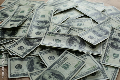 A pile of one hundred US banknotes with president portraits. Cash of hundred dollar bills, dollar background image with high resolution