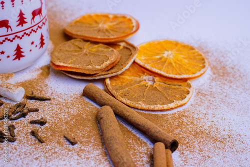 A pile of orange slices and cinnamon sticks on a white background. The oranges are cut in half and the cinnamon sticks are whole. Concept of warmth and comfort