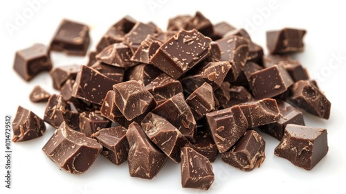 A pile of roughly chopped dark chocolate pieces on a white background.