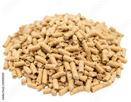 A pile of small, cylindrical wood pellets, commonly used as fuel or animal bedding, showcasing their textured surfaces and natural color.