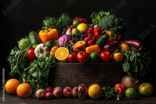 A pile of spoiled fruits and vegetables in a compost bin, vibrant colors contrasting with decay, symbolizing food waste and sustainability