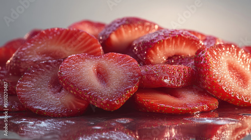 A pile of strawberry slices, with glistening juice reflecting light, arranged on a cutting board, ready for a fresh, healthy snack or dessert topping.