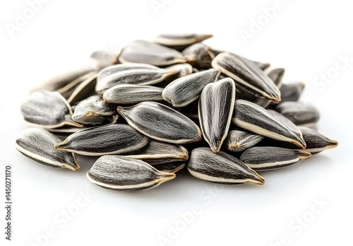 A pile of sunflower seeds close-up photo with a pure white background, highlighting the shell texture and color.