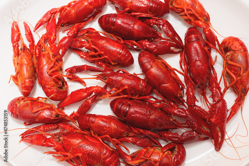 A pile of tasty boiled crawfish on a round white plate on a white background. Top view,closeup, copy space.