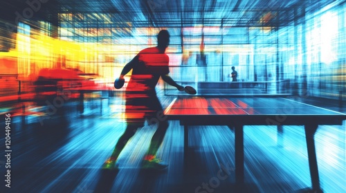 A ping pong match in a vibrant recreation center, with the ball captured in motion blur, energetic comic book style