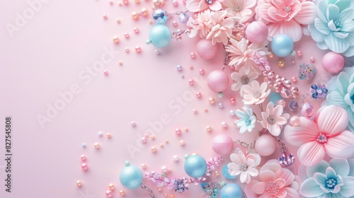 A pink and blue floral design with many small beads and pearls