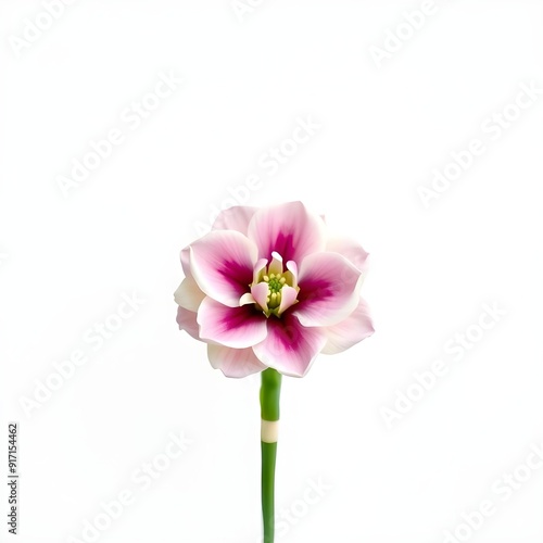 A pink and white flower with a yellow center on a green stem against a plain white background