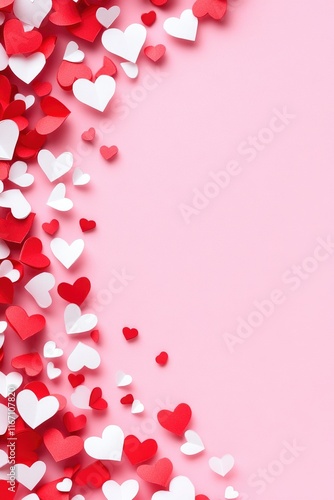 A pink background with red and white paper hearts scattered around it, creating an atmosphere of love for Valentine's Day. The composition is viewed from above, with the left side filled in to create