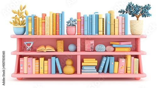 A pink bookshelf filled with colorful books and decorations, beautifully rendered in 3D.
