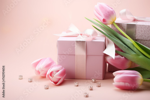 A pink box with a ribbon sits on a table next to a bouquet of pink tulips