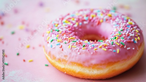 A pink donut with colorful sprinkles, ready to be enjoyed as a sweet treat