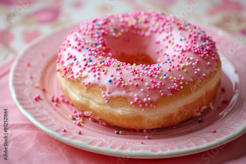 A pink donut with pink frosting and sprinkles on a pink plate.