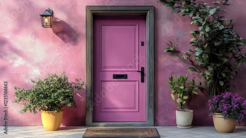 A pink door with a black mail box and a black handle