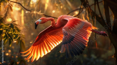 A pink flamingo takes flight, its wings spread wide as it soars gracefully