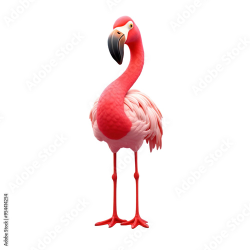 A pink flamingo with a long neck and long legs, standing on a black background, looking to the side.