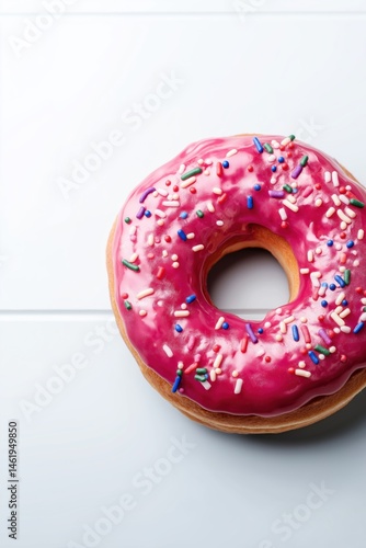 A pink frosted doughnut with sprinkles on top. The doughnut is sitting on a white background