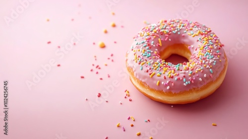 A pink glazed donut with sprinkles sits on a pink background with a few sprinkles scattered around it.